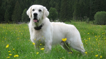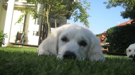 Hm, der Alte da hinten bin ich und das hübsche Kerlchen vor mir ist Mika. Meine Mama sagt immer, wie hübsch zwei(!!) Goldies dauerhaft auf ihrem Rasen aussehen würden…!!!